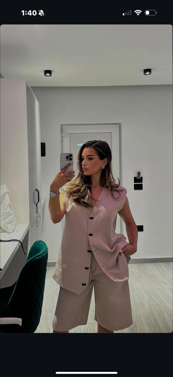 Ky set përfshin një jelek elegant dhe pantallona deri në gju, duke sjellë një look të strukturuar dhe bashkëkohor. Dizajni i tij reflekton një stil serioz dhe të kuruar, ideal për ato që preferojnë elegancën me karakter.