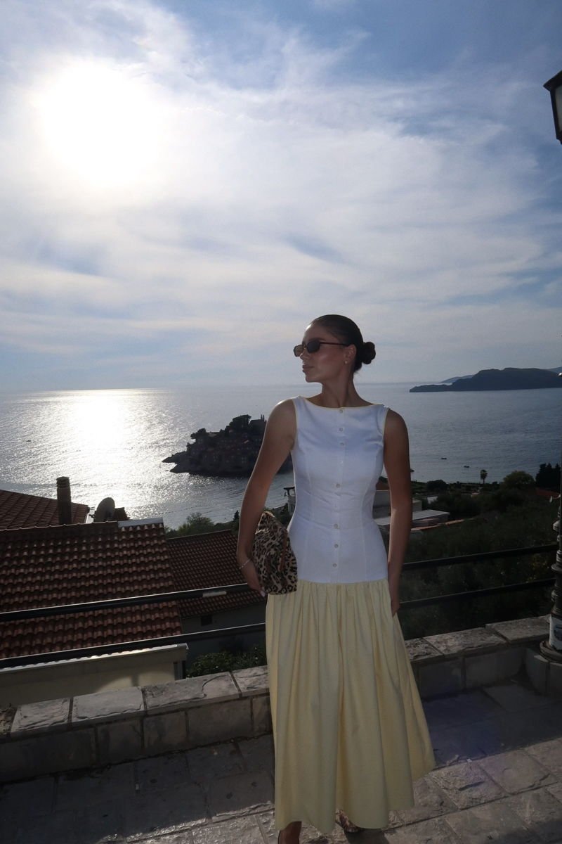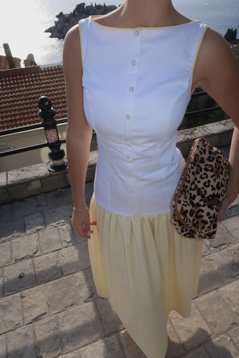 Sveti Elegance Dress është një kombinim unik që përfshin një fund të gjatë në ngjyrë të verdhë dhe një jelek në ngjyrë të bardhë, duke krijuar një pamje të sofistikuar dhe plot dritë. Fundi i gjatë sjell elegancë dhe lëvizje të bukur në çdo hap, ndërsa jeleku shton strukturë dhe stil modern. Ky kombinim është ideal për evente, darka apo raste ku dëshironi të dalloheni me një look të veçantë.