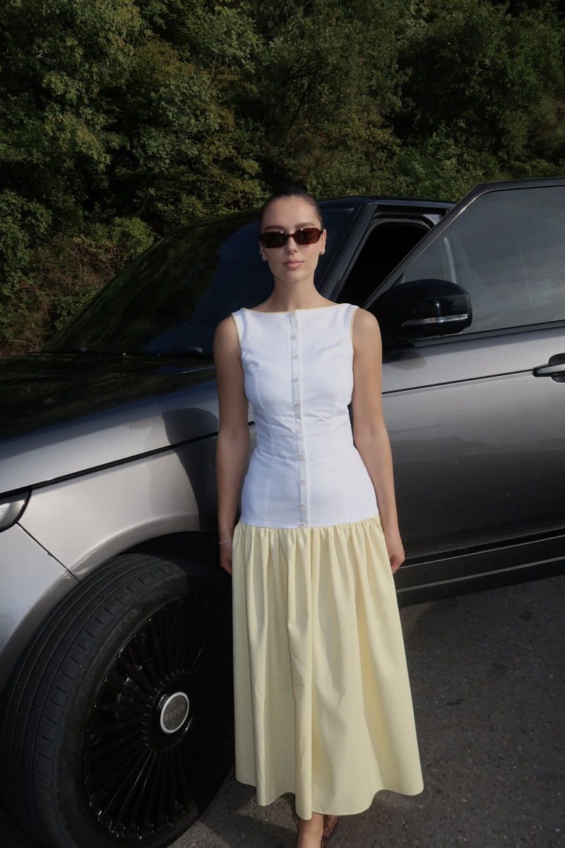 Set elegant me fund të gjatë të verdhë dhe jelek të bardhë—kombinim perfekt i finesës dhe stilit modern.