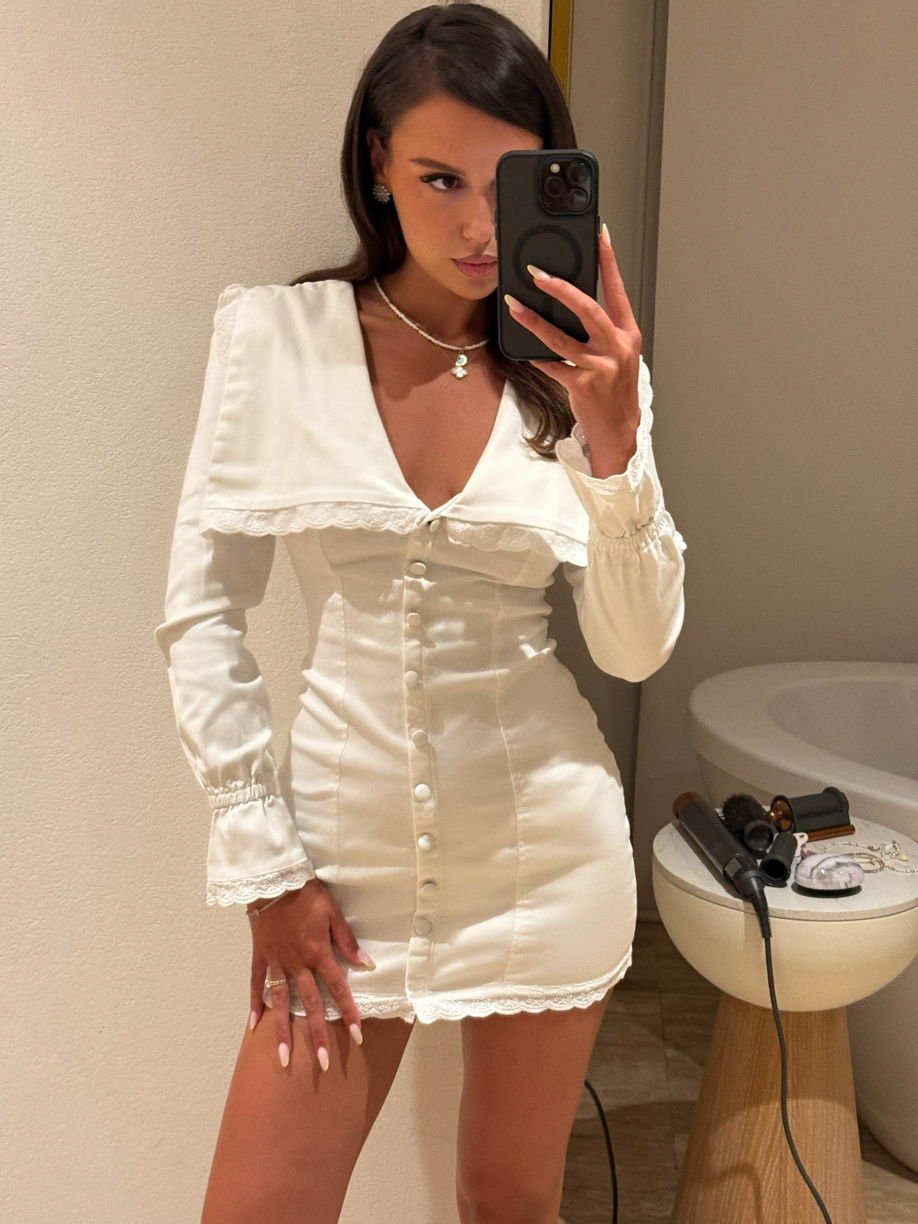 Ky fustan i bardhë është një përfaqësim i pastër i elegancës dhe minimalizmit. Me një dizajn të rafinuar dhe linja të pastra, ai krijon një pamje të sofistikuar dhe të përjetshme.