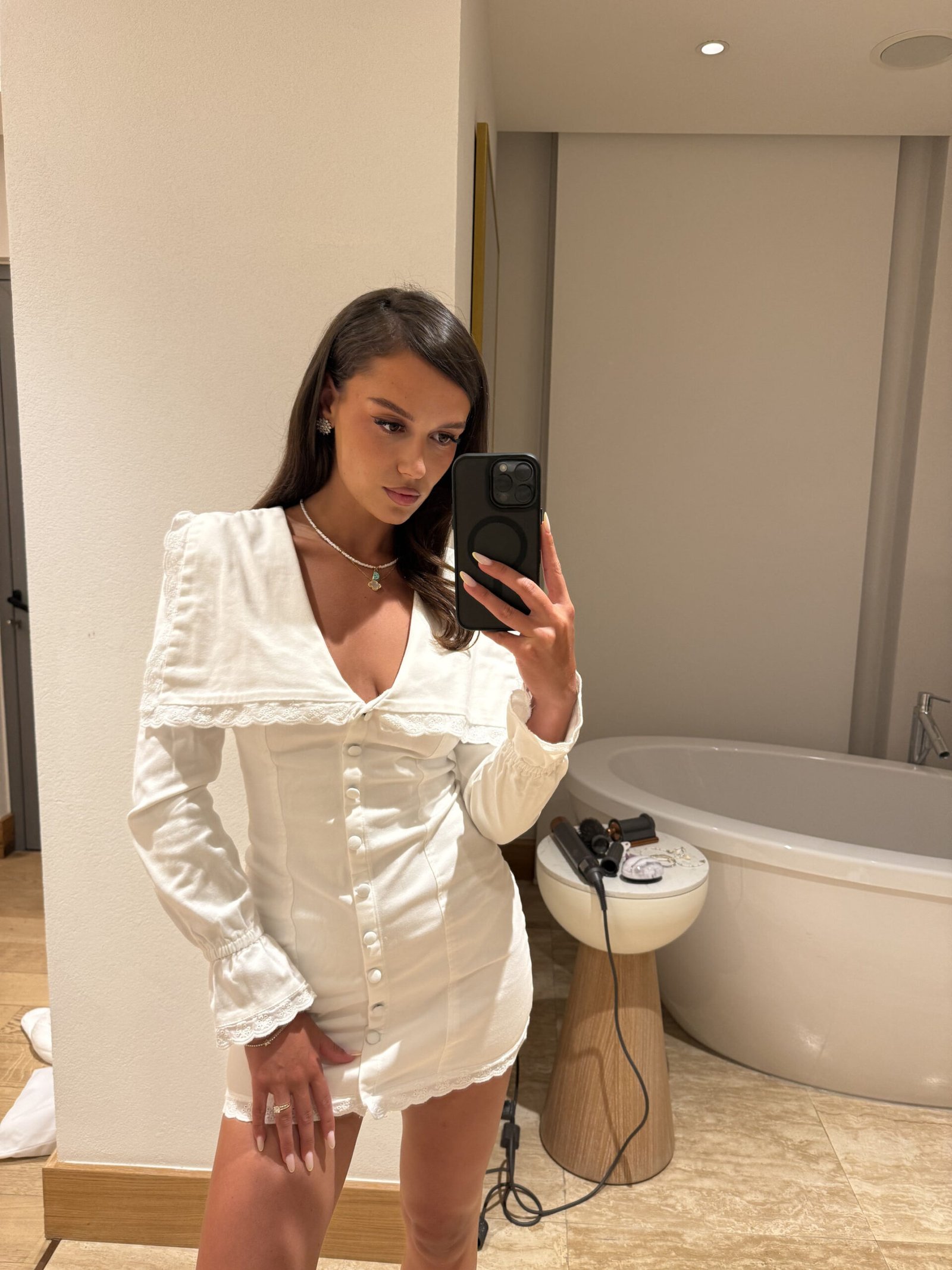 Fustan i bardhë i punuar me dorë që ndërthur thjeshtësinë me elegancën moderne.