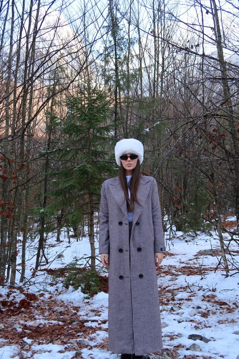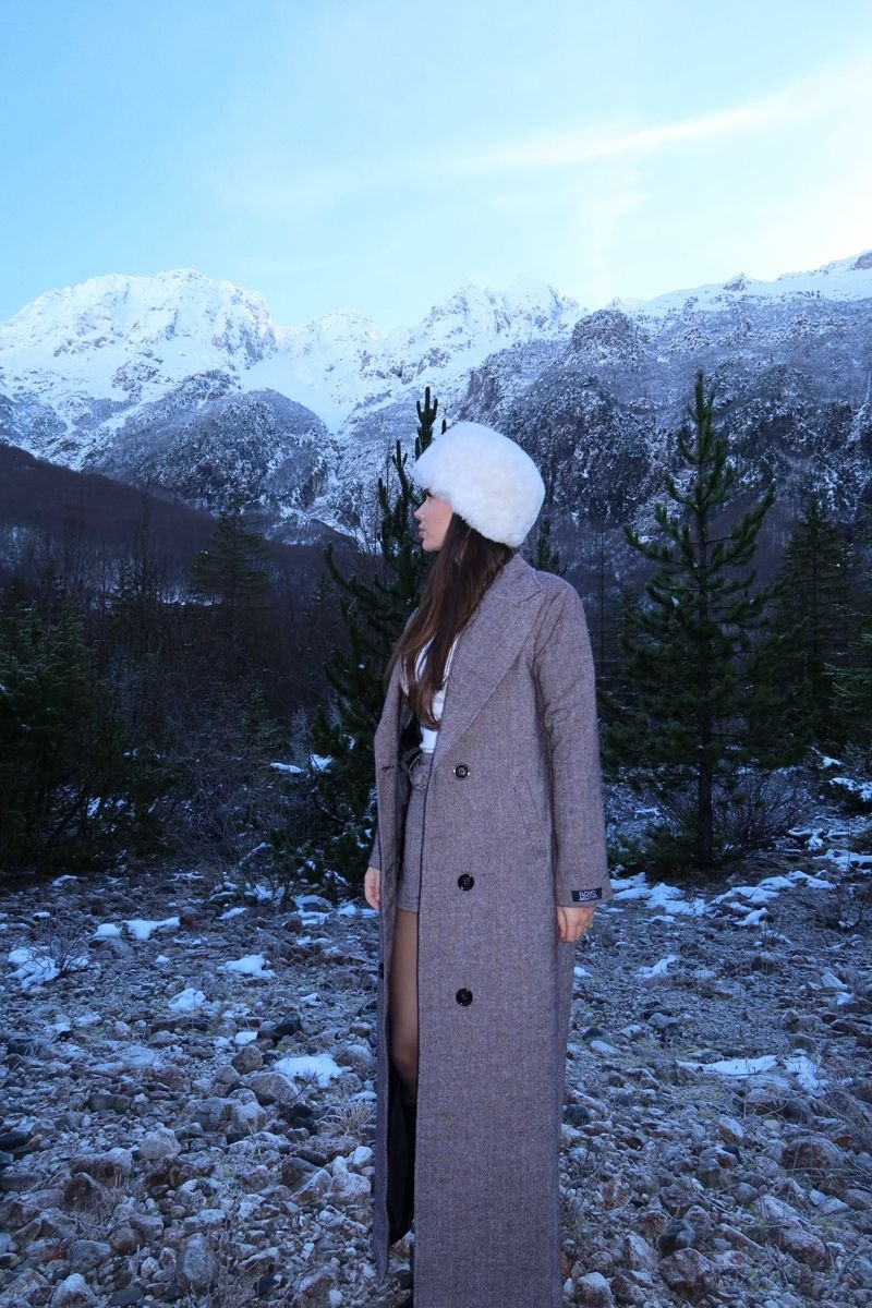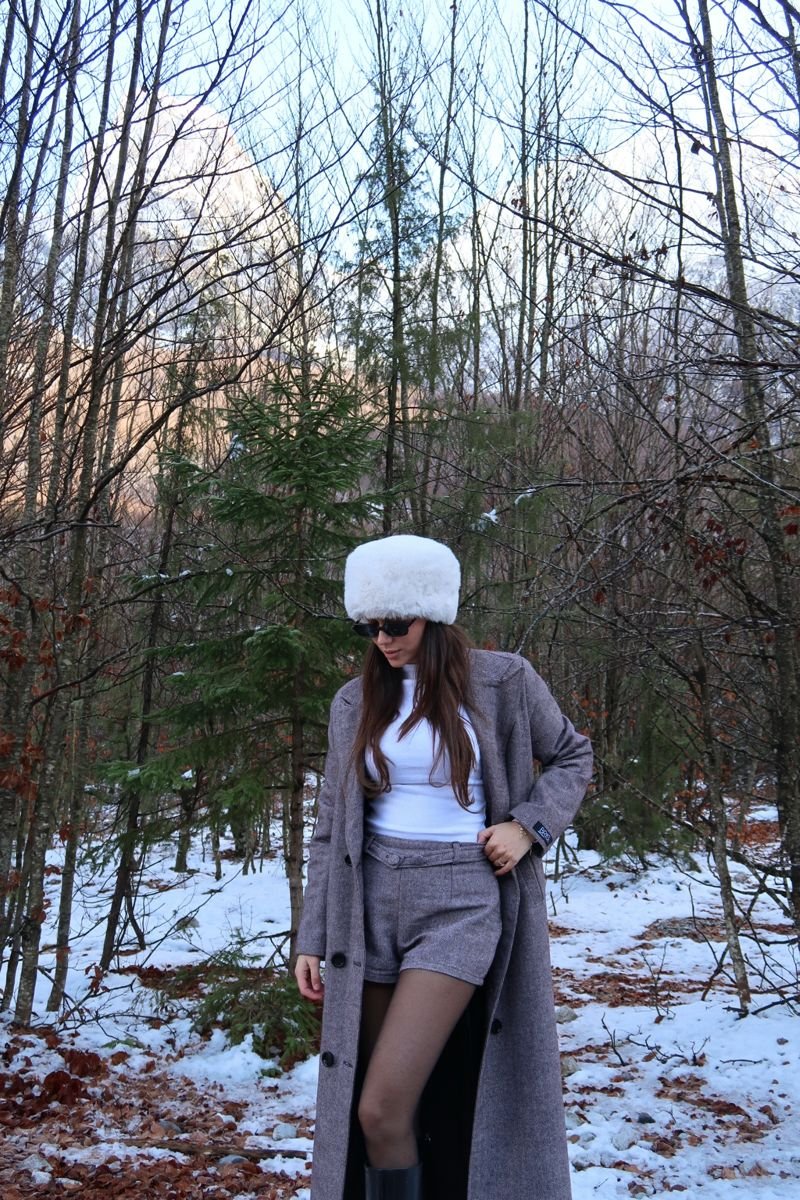 Set modern në ngjyrë gri me xhaketë të gjatë dhe shorts—kombinim unik mes stilit dimëror dhe atij casual